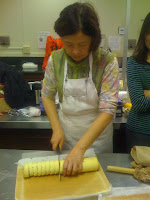 這天說是要做毛巾蛋糕, 就是一般做蛋糕用的那種海棉蛋糕, 只是用長烤盤下去烤, 下面的是我們一組烤出來的, 就那些蛋阿 糖阿 麵粉阿 加一加 拌一扮 mixer 打一打, 烤好後稍涼就可以加任何愛吃的水果醬或奶油, 我們用草莓醬.
